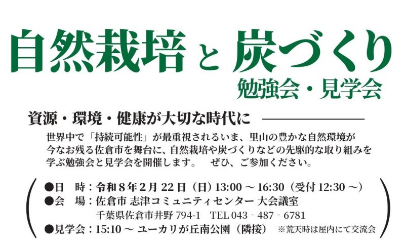 2026年2月22日(日)「自然栽培と炭づくり」勉強会・見学会を千葉県佐倉市で行います。